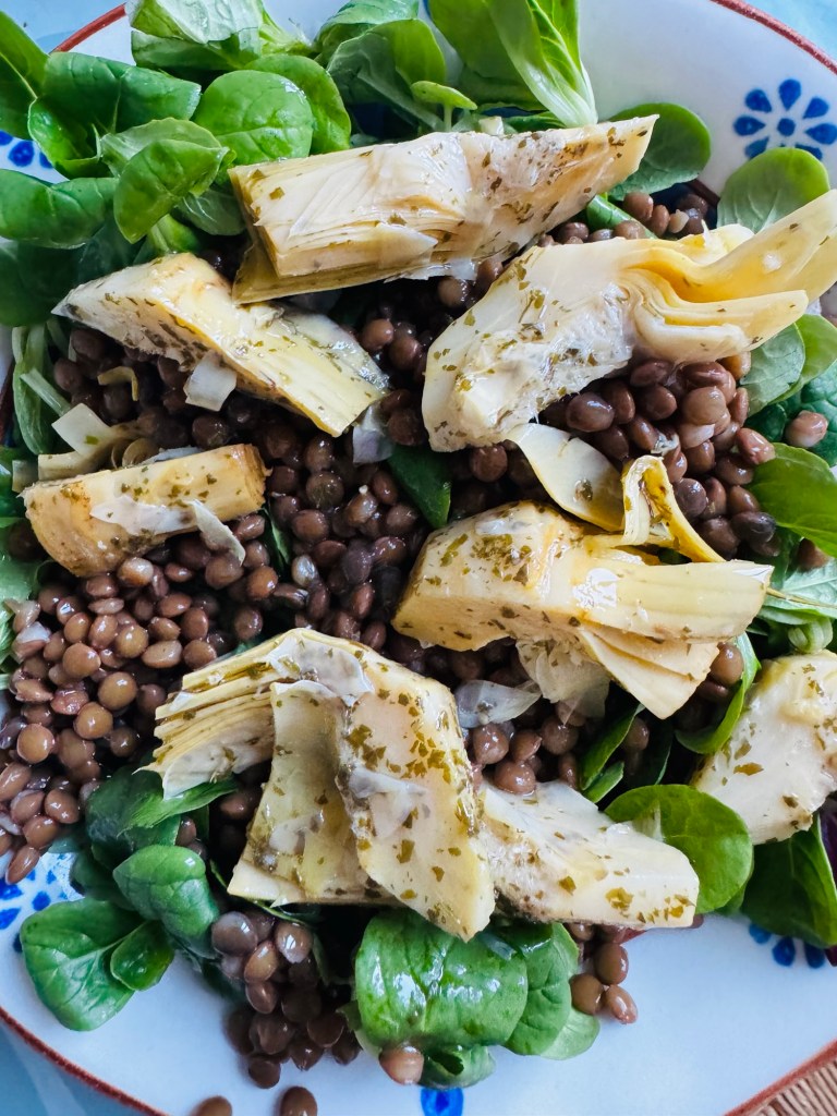 Left: micro greens from a bag, 1/2 a can of drained lentils, 1/2 a jar of seasoned artichokes with some of the oil from the jar as dressing.