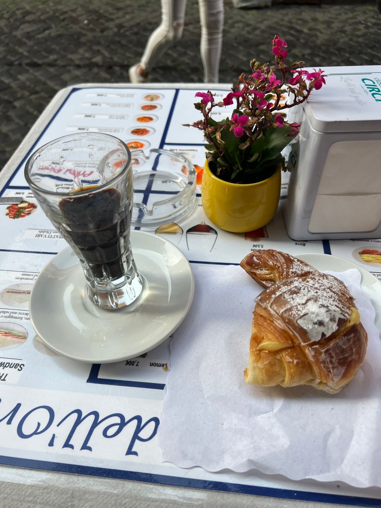 Today, I continued my attempt to immerse myself in Roman life. In the morning (~6:45) I walked to a local cafe to order un caffe freddo e un cornetto. I stumbled a bit, but was able to communicate my order to the owner with only a tiny bit of English assistance. He was very welcoming and happily spoke in English when necessary. I took my meal outside and watched people walking by on the stone street. During my meal, a street cleaner drove through and sprayed near where I was sitting. The cafe owner ran out yelling at the driver, then turned to me and smiled while shaking his head. I laughed and shrugged it off.