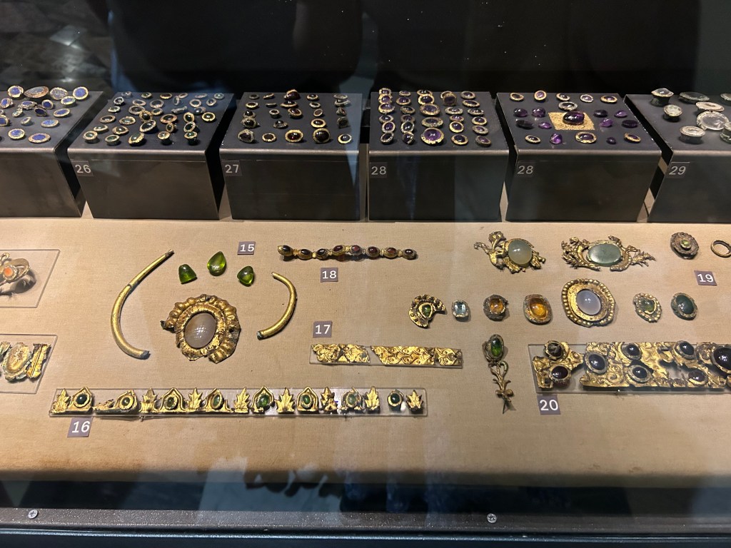 For average, I really like the small statue of a boy taking a thorn out of his foot. The professor talked about how the Romans liked voyeurism and depicting that in their statues. I feel like the statue should be placed in a garden to really complete that atmosphere. And for small, I saw more jewelry in the Capitoline museum that were pretty tiny but beautiful. This time I learned my lesson from not taking pictures of the jewelry at the Villa Giulia and now I have included them below. The jewelry was also made of thin gold metal and they used colorful stones like amethyst.