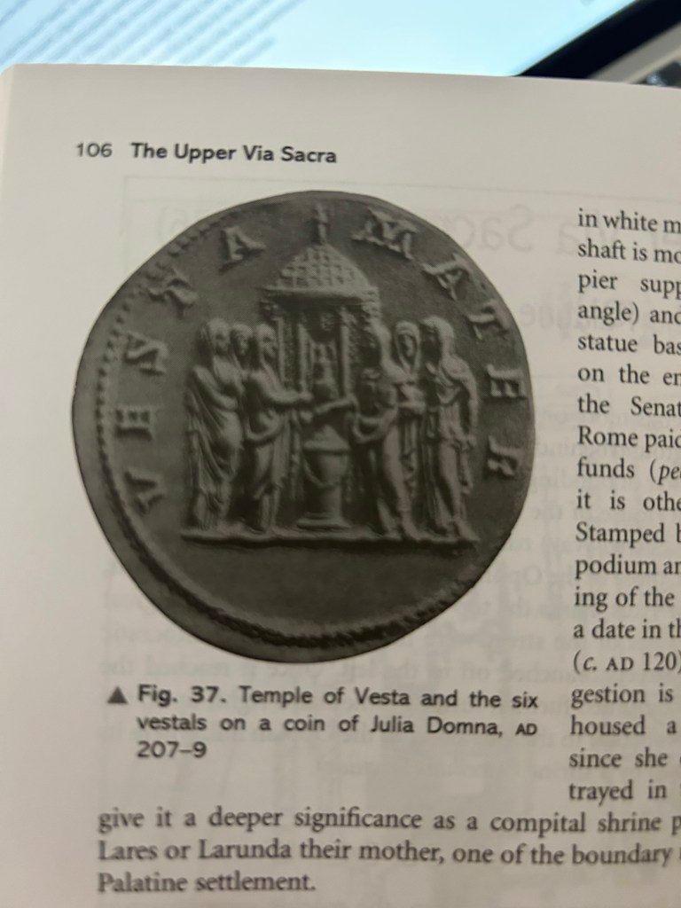 To start the word “vestal,” comes from the goddess Vesta. “Vesta was a goddess of the household hearth, a figure of great importance in early royal ritual” (Claridge, pg. 106). Vesta had her own temple where people worshipped her as well. Her temple was even placed on Roman coins, it had a “flimsy hut-like structure” (Claridge, pg. 106) and it contained other symbols like dragon heads and a conical roof on her temple. However, interestingly enough, there are no statue of Vesta in her own temple. Instead, there was a fire that was upkept and never let out. The upkeeing of this eternal fire was done by the Vestal Virgins, “the handmaidens of Vesta” (Claridge, pg. 106). The ashes of the fire were thrown out into the Tiber river on June 15th of every year. The Romans were deeply superstitious and believed that if the flame ever went out, the city was doomed to destruction.
