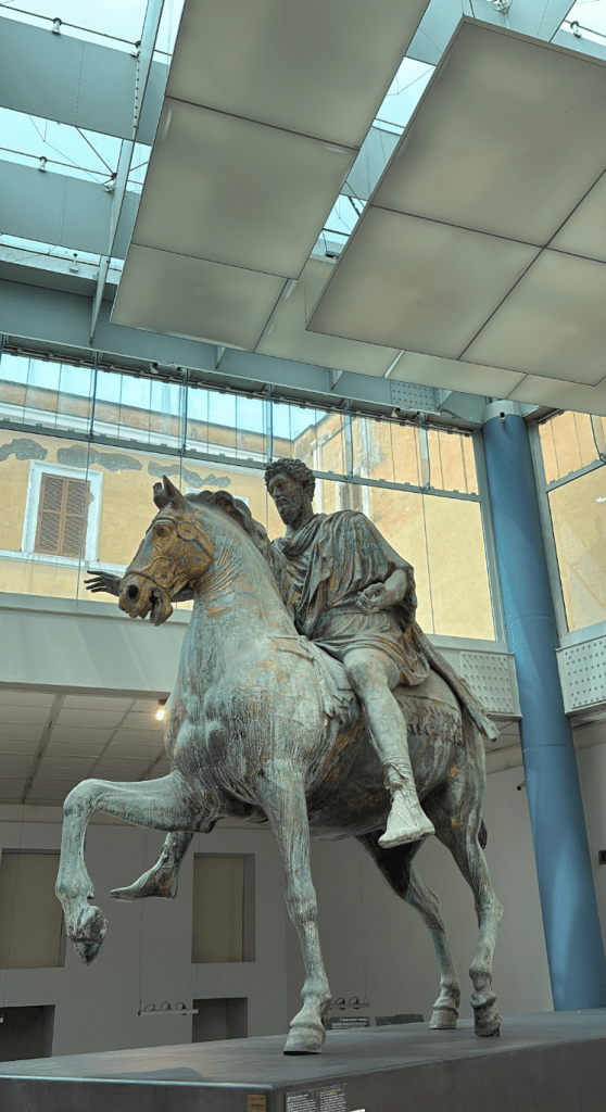 We fictionalize history when we admire people in power and choose to only remember their great qualities. A good example of that is Marcus Aurelius. He was a Roman emperor and also a philosopher who is known for his wisdom and leadership during hard times. People often speak of him with a kind of awe, like he was more than human. Seeing his statue on horseback in the museum showed just how much respect and glory the Romans gave him. The statue is large and full of motion. He looks calm and strong at the same time. It reminded me how stories about leaders can become larger than life, especially when they are told for generations.