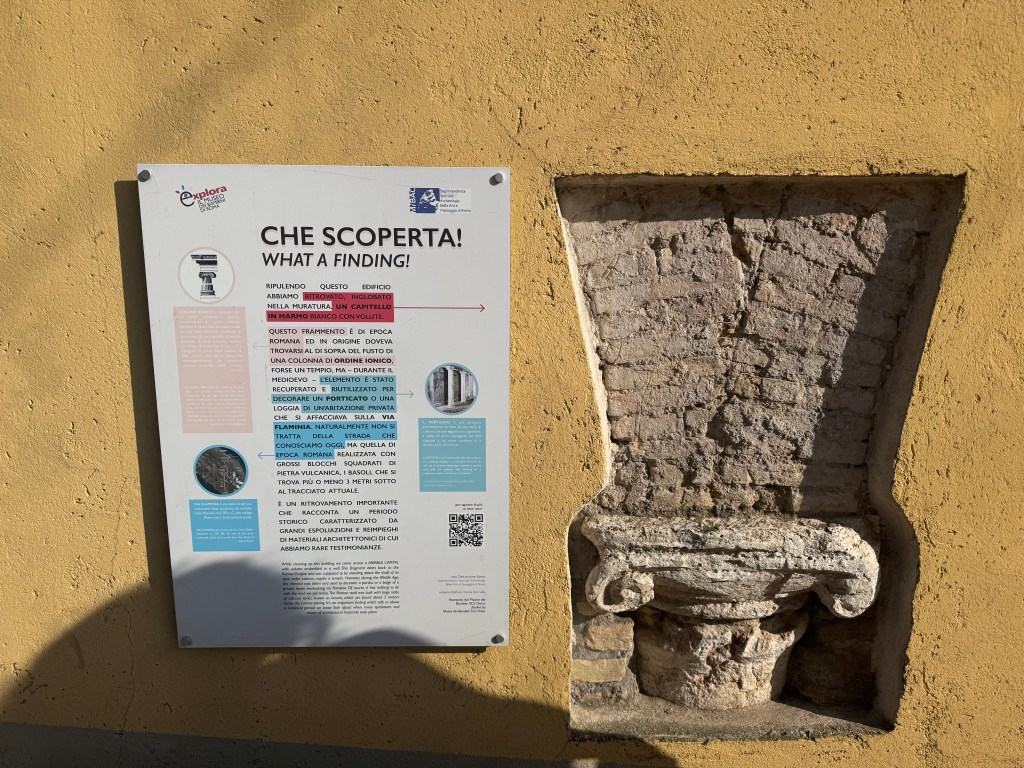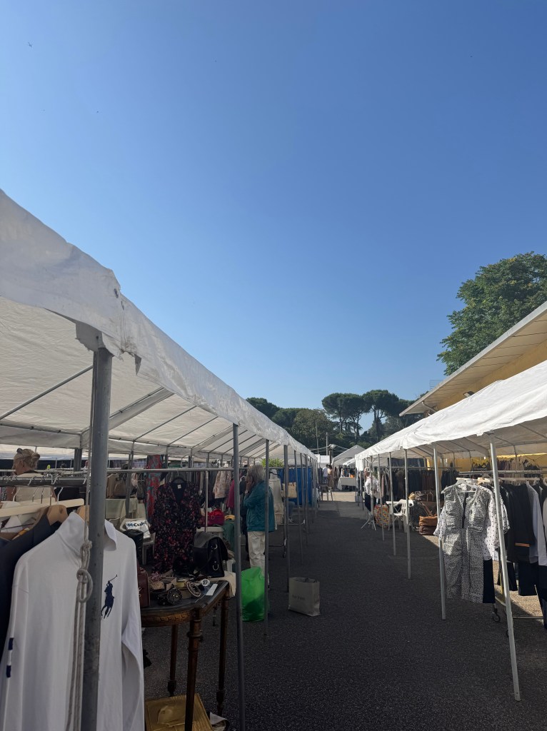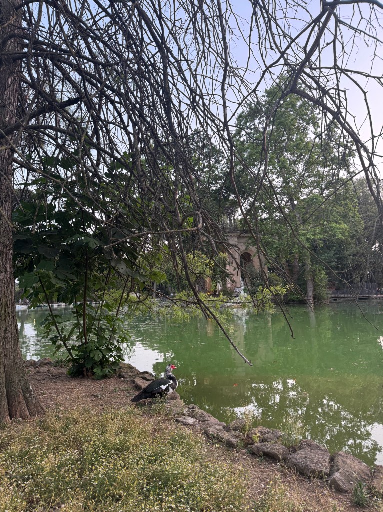 In the morning, I had to do some boring but necessary things like laundry and grocery shopping, but I always enjoy walking around the grocery store and discovering new things to try, usually some sort of fun drink, and I got a Coke Zero with lemon flavor (lemon flavor was barely there). I worked on my presentation with Jessica, which was on a super interesting topic, the Vestal Virgins! We then ventured out to a flea market that we have had out eye on and is only open on Sundays. We got some yummy pizza on the way, spicy salami, and I do get the appeal of the thin crust and it being eaten with a fork and knife, but I miss the NYC pizza with some more substance to it. The flea market was full of interesting things and old clothes, which I did not purchase, but enjoyed browsing. Seeing what each person was selling gives some insight into what kind of person they are or were. I generally love thrifting, so this was super fun, and they had cool antique trinkets like pill boxes, bottle openers, and grape stem scissors, among others! It was, however, extremely hot, and the vendors were packing up. We met a cute, playful dog, and saw a super interesting building side that had a medieval column randomly found when cleaning a building, which is just something normal that happened here in Rome. Walked some more and then reached our goal of the Villa Borghese from Saturday, which technically means it took us like 24 hours to get there. Super worth it and a beautiful place, I especially liked the ducks and turtles. The summer concert still going on in the Piazza del Popolo made the walk back fun. Then a self-made dinner and a much needed rest!