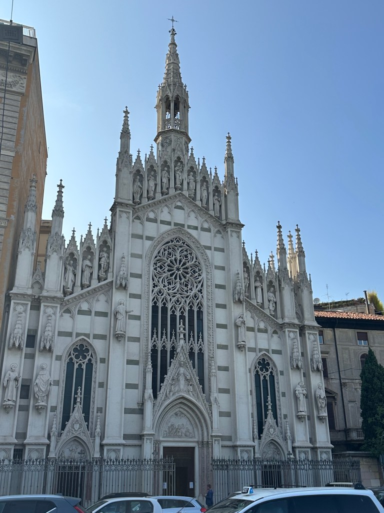 A bit after the Colosseum I had also made a second trip to a gorgeous Gothic church (somewhat) near my apartment, the Museo Delle Anime Del Purgatorio. The exterior is absolutely stunning and the inside is just as commanding. The stain glass windows, the beautiful artwork, and this one sculptor titled “The Veiled Christ,” which is one of the best pieces of art I’ve gotten to see in Rome so far, made the church such a gorgeous experience. With the conversations of power and the ways physical space have been used to exert and reinforce said power, I was thinking about the church, not just as an individual building but as an institution, and the power it has had and continues to have over so many people, including myself. With such tall walls and the illuminated eyes of the saints watching over you, how could you not fear some higher power?