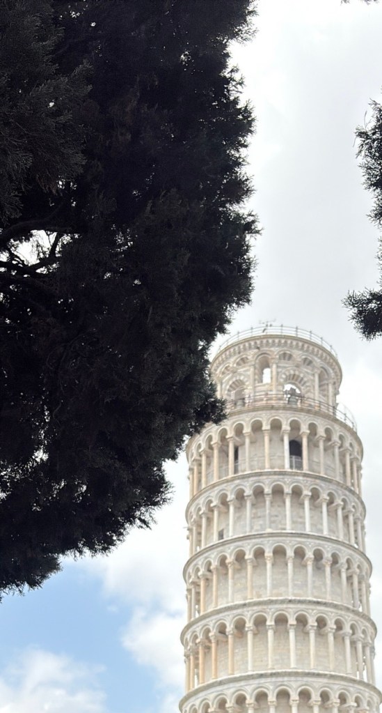 This is a late post, though, I think it must be shared! Last week we were able to explore so many places! We started off the trip going to Pisa where we saw the leaning tower. I remember when I first saw this building in a movie and I asked my mom if it was real. I could not comprehend that this was even possible. At the time, it defied gravity and made it a miracle. After my mom explained the history behind the Pisa tower I was a bit disappointed because it–the tower–lost a bit of its mysticism. Anyways, when we got to the tower it was packed. People were all fighting for a spot to take a picture with the tower. My favorite part of this trip was how everyone wanted to take some iconic pictures. For example some acted like they were pushing the tower, while others were karate kicking it. This was great!