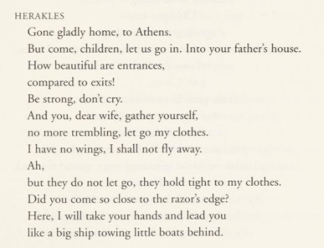 The play is one of four by Euripides which Anne Carson translates and offers her insight on their ramifications on the story and what it means to both the original audience and the readers, who are experiencing it thousands of years in the future. I emphasized that Hercules- or Herakles for the sake of consistency- intrigued me for his dual nature as man and god. The traditional canon of Herakles is that his story begins with the slaughter of his family by his unwilling hands, a culmination of Hera’s hatred. The subsequent labors he embarks on, while bound to King Eurystheus, become a journey of atonement for sins not truly his own. Carson says that Euripides is interested in “people as people- what it’s like to be a human being in a family, in a fantasy, in a longing, in a mistake.” Thus Herakles serves as the perfect specimen to dissect. He is human and god- fallible and infallible- and able to fufill all of Euripides’ desires to see both a myth and man unravel. His feats are colossus in magnitude, and appropriately as are his faults. But through Herakles’ legendary status comes a contradiction. Questionable divinity aside, he is already inherently inhuman in strength and will, besting even death itself (he climbs into Tartarus unarmed and returns alive). “A man who can’t die is no tragic hero.” How can one find tragedy in such a defiant story?