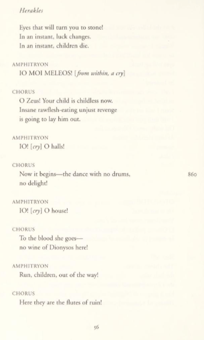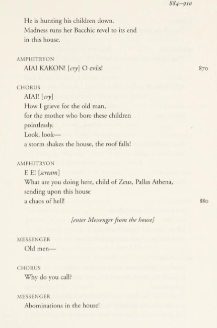The survivors, that is the distant chorus, the messenger and Amphitryon, watch helplessly and fearful as Herakles butchers his wife and children. Herakles emerges from his spell, mortified and confused as to why his family are dead before him. The realization that he has killed them is what finally breaks him. He nearly succumbs to his grief before Theseus, who he had freed from Tartarus, appears to repay the favor- pulling him out of his own personal hell and towards the uncertain future, one where the mythic Herakles is shaken.