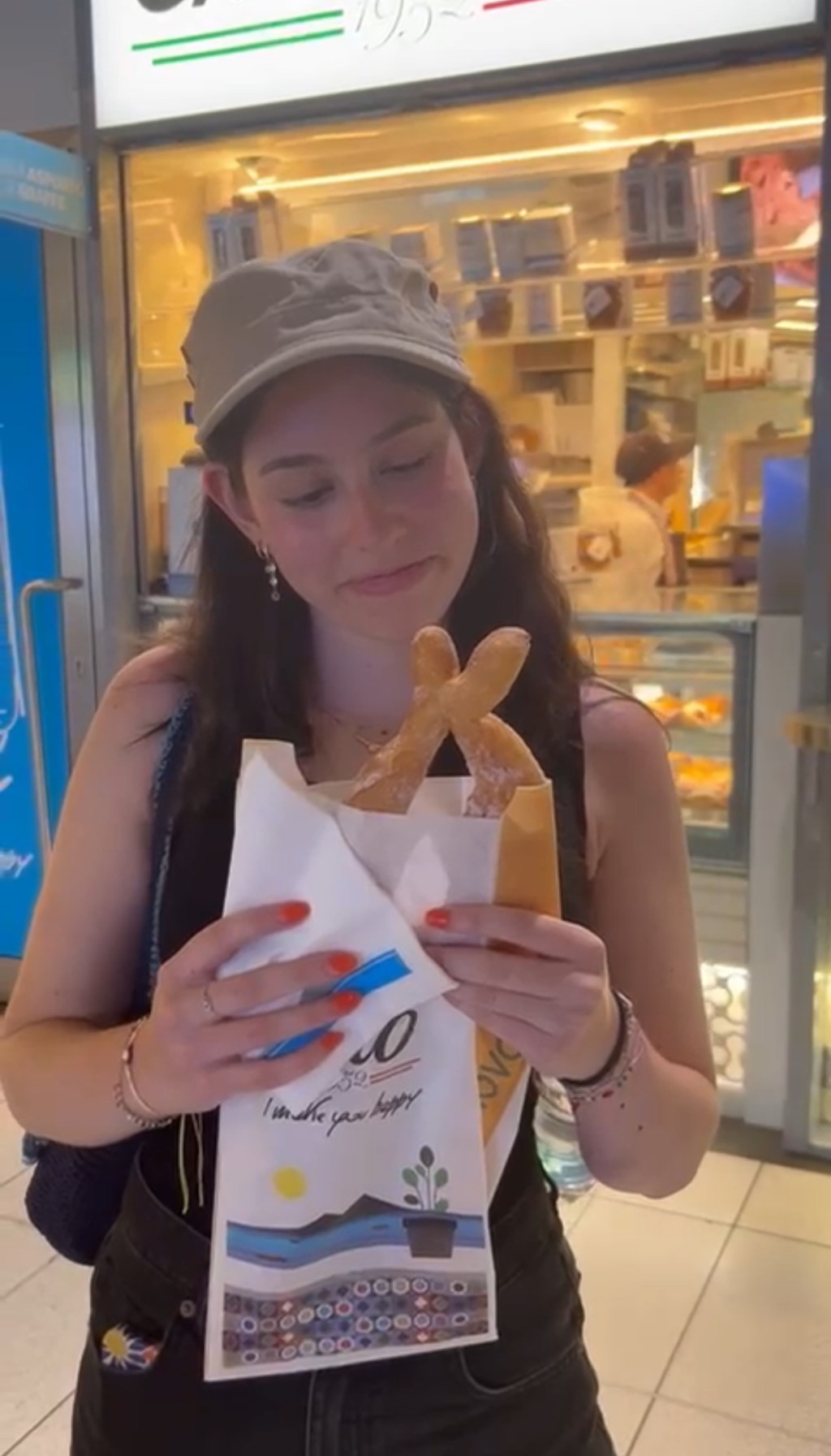 Last morning in the airbean b :,(. Got breakfast. This is where the graffe day starts. Let me take you guys back. When I was just a wee girl (thursday) we arrived at the naples station and something magical happened. Moussa got a graffe near the ticket machine and because of his kind soul he shared it with me and jessica. This was love at first bite. Fluffy and sugary and amazing. I bought my own and thought about it all day every day. Everything I ate I wished it was a graffe. Jessica also got her own and a bomba ( same thing but circle) and also because she has a kind soul she let me have the rest of hers the night we stayed in the hotel in pompeii. This is where it all started. Saturday they didn’t have lunch at the cafe in Capri and then Sunday the same thing. But I did not give up. Back to Monday morning breakfast. I say “ciao sir do you have a graffe today”, and seeing the desperate look in my eyes he offered me a bomba, which satisfy me, but nothing compares to the one in the station. I will decide more. Jess and I have like 40 ish minutes before our train so I find a bakery that has graffes. We walk there with all of our backpacks and stuff and they are SOLD OUT. THIS IS 10 AM. Ok next cafe/bar I got one but it was stale and not yummy. Now i’m on a mission. I WILL eat the station graffe. We take the train to Naples and put our stuff in lockers then start wandering. Got some more souvenirs, and then went to our ultimate location for the day which was the Complesso monumentale Pio Monte della Misericordia to see the Carravagio, the seven works of mercy. All the little different scenes in it were so cool and beautiful to see and the way caravaggio harmonized and captured them. Feeding the hungry, giving drink to the thirsty, clothing the naked, sheltering the homeless, visiting the sick and imprisoned, and burying the dead. We rubbed the puicinella sculpture nose, and then unfortunately the museum with the veiled figure was sold out so we wandered more. We went to the place we thought the modern willy wonka movie was shot in but turns out that was in milan and this one is just similar. We got food (mcdonalds we are so sorry naples pizza we just couldn’t do it anymore). Now. To what I have been WAITING for. On our walk back to the lockers I had Jessica make a detour because I needed the graffe. Best thing ever exceeded expectations so amazing and fluffy and sugary and delicious. Back to the lockers , I realized I needed more. SO DID THE MAN AT THE COUNTER. PAID FOR 1 HE GAVE ME 2. THANK YOU CHALET CIRO <3333333. Amazing train ride with the graffe. Came home and thought about the graffe the whole night and missed the joy I felt eating it. Will forever think about this store.