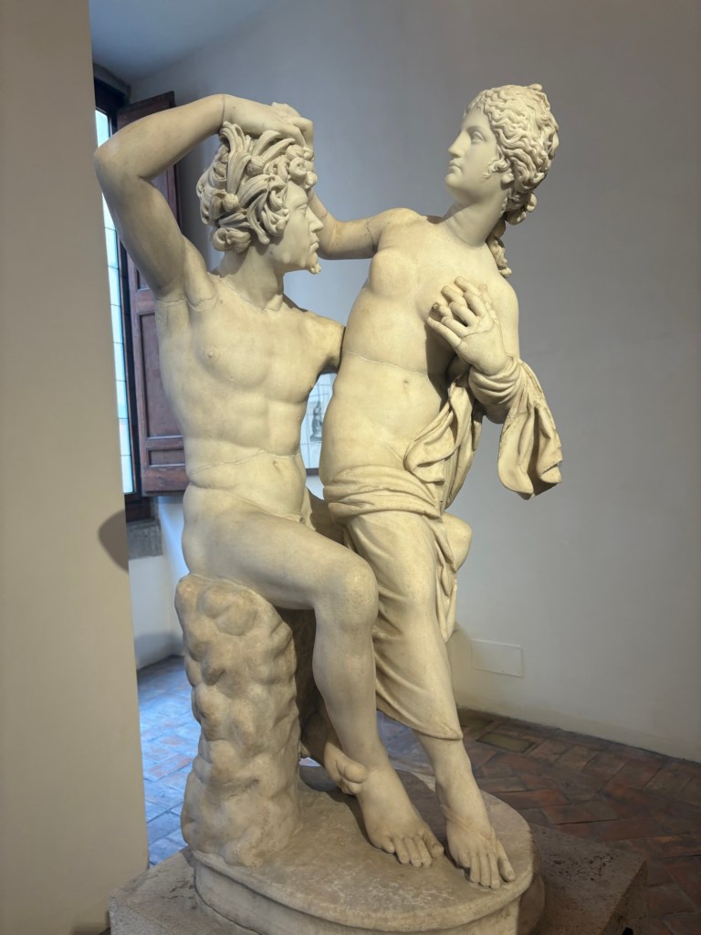 Professor Yarrow showed Julia and I a statue of a satyr with a young boy teaching him to play an instrument which was seen as harmless right, wrong. Apparently the centar has his leg up to hide his erection. The sculpture is of Pan teaching Daphnis to play the flute and according to Ovid, a great poet, Daphnis was the victim of a love tragedy and was petrified by a jealous nymph after he made love to a woman.