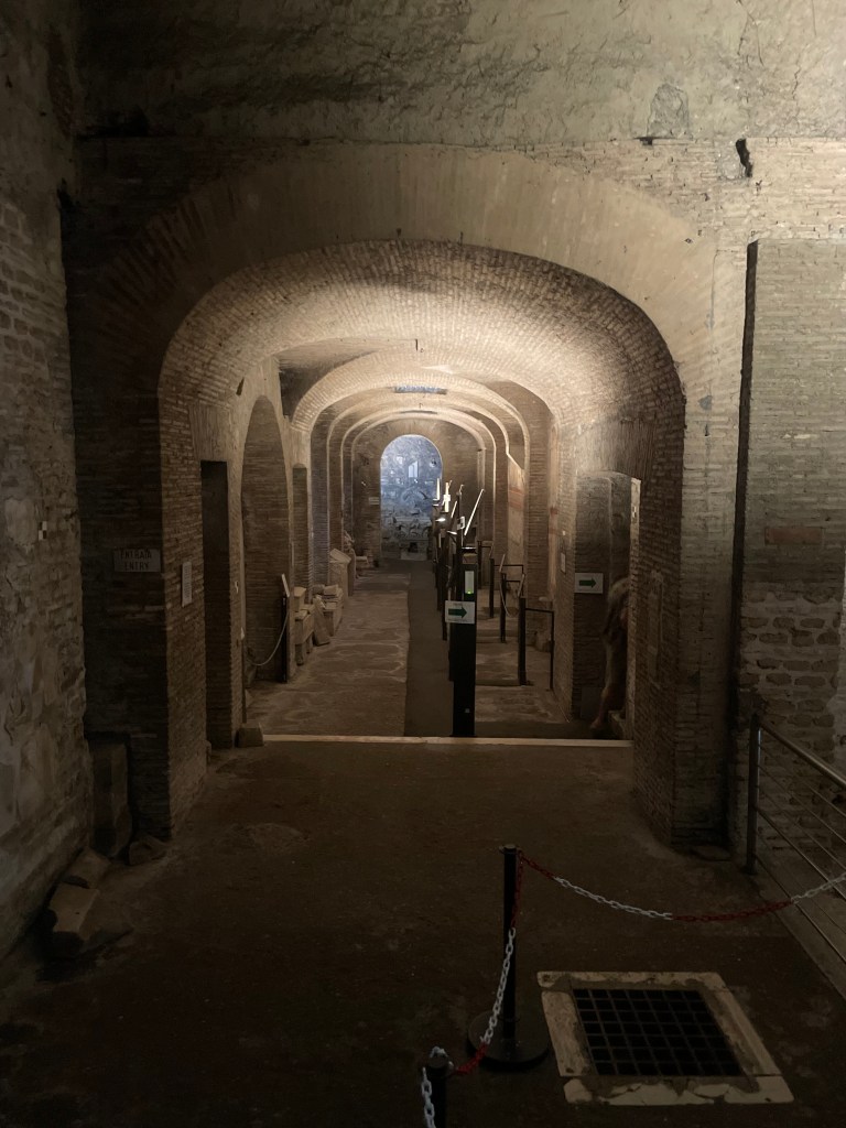 At the Church, when we started descending into different time periods and histories, I was reminded of our time at Herculaneum. The different layers that were exposed in some of the houses that were present in the Herculaneum left me in awe. With each paint of plaster, brick, and wall there comes a history that is attached to it. Seeing these things was just spectacular and reminds me how history is built on top of itself. The physical descent of the church added another part to this already intriguing trip. I was able to actually walk through history PHYSICALLY. This is extremely cool and is an outer body experience.