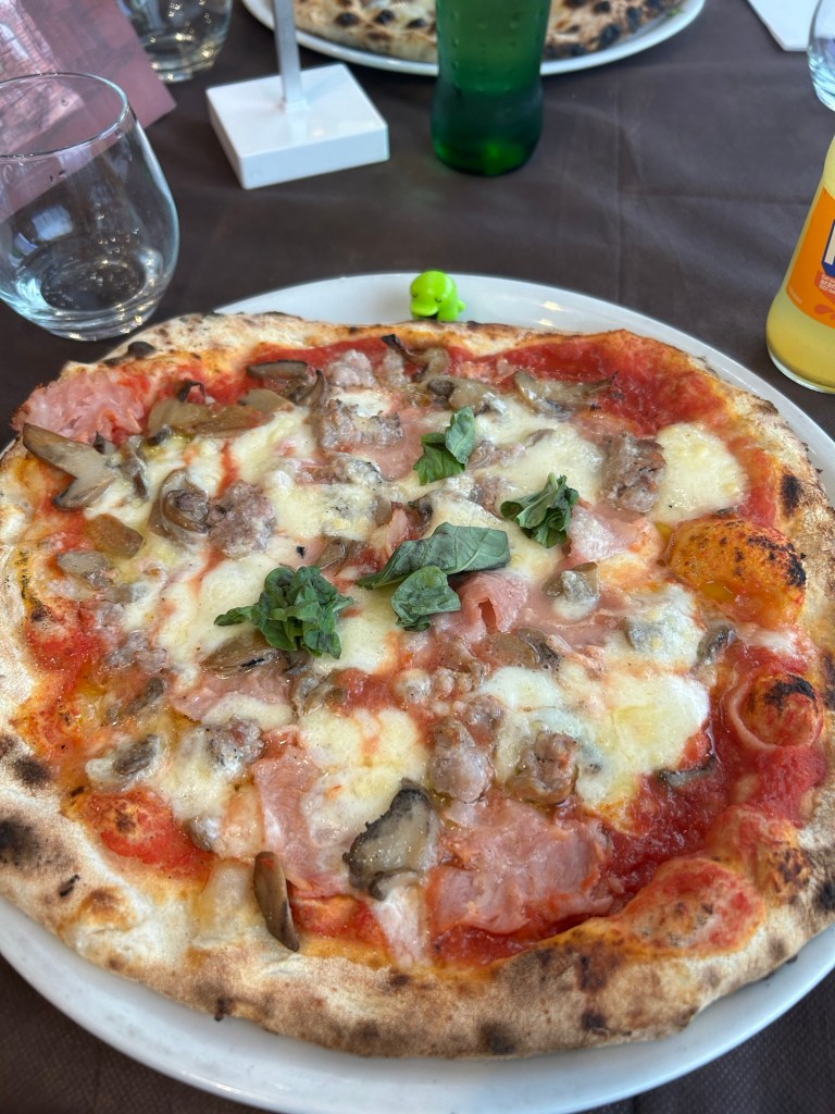 I forgot what kind of pizza I got for lunch today. However, I do remember I couldn’t finish it, so I ended up taking it to go, shared a to-go box with Khadija with her half of the pizza. Both pizzas are forgotten at the hotel in Pompeii. We were all in the rush, trying to catch the train on time. It was not much of a big deal at the end of the day, but I still feel guilty for wasting food, especially food that is delicious.