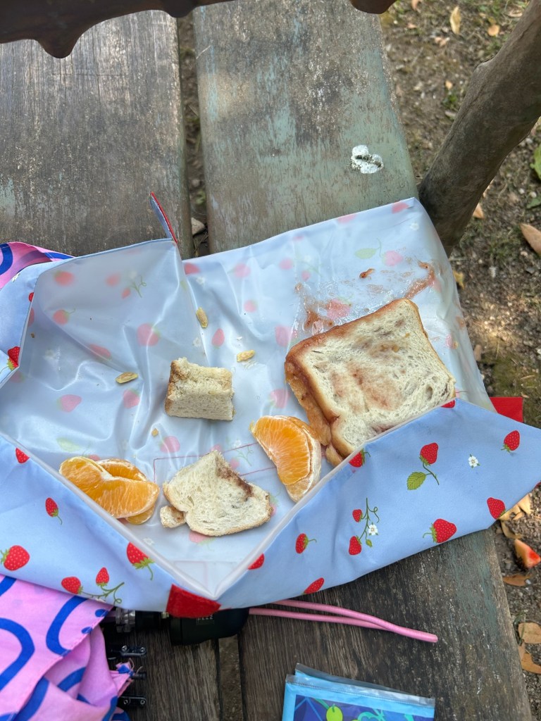 The lunch I packed looked like they had a huge fight with each other in my bag. Oh, also, I just realize there is a drop of bird poop on the bench💔. I did not even notice when I sat there and ate 💀.