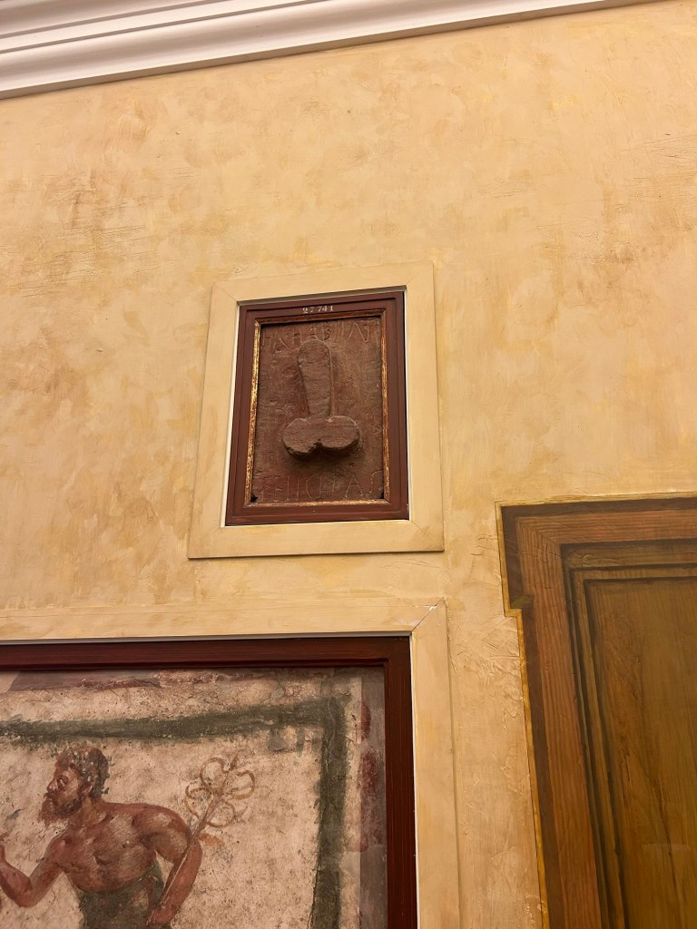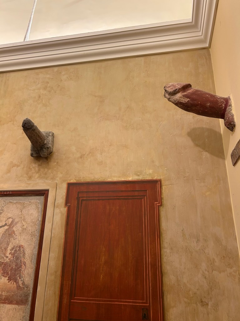 I thought I had overcome the dilemma of “minimum AC to protect the artifacts”. I would say the Museo Archeologico Nazionale di Napoli might be the hottest museum we’ve been to. But I would definitely say the most heated-up room is the Secret Room. When looking at artifacts from different time periods, it is always useful to remember the differences in people’s beliefs and values and how they would change over time. In this case, the difference lies in interpreting the meaning and representation of the male genitalia – apotropaic. The male genitalia not only represents one of the many symbols of apotropaic, but a particular reaction, laughter from the viewers, can also be considered apotropaic. To be fair, I found some of the artifacts, particularly in this room, to be funny. Is funny to think people back in the day would put in hard work to create these.