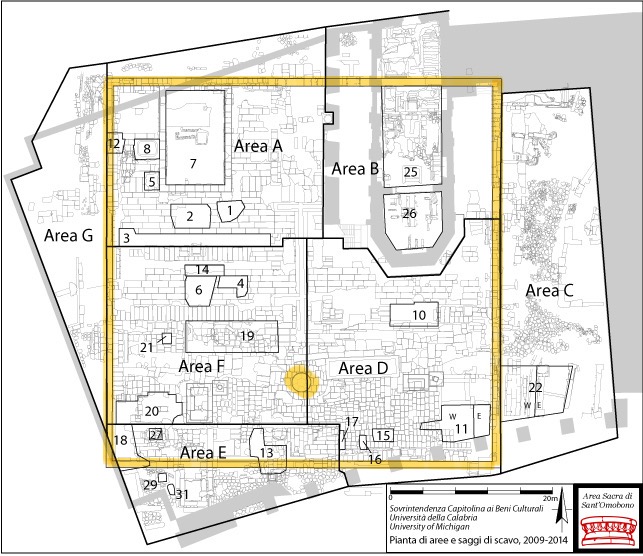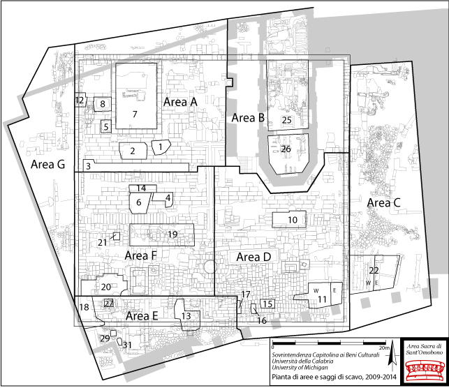 The temples share a single, large platform and each has an altar in front of it. Under the nave of S. Omobono is the aedes of Mater Matuta, while the temple of Fortuna lay further S. The visible temple remains seem to belong to the reconstruction in 212 B.C. (Livy 24.47.15, 25.7.5-6; Sommella).(Dr. Dorian Borbonus)